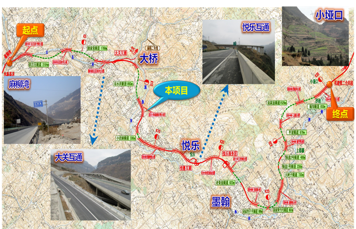 项目起点顺接水麻高速,沿大关河升坡,经四方石、大园子、跨过洒渔河后经悦乐镇、胡家湾子、银盘、沙池,在小垭口附近接第二合同段,路线全长35.129公里。全线桥隧比78.71%。