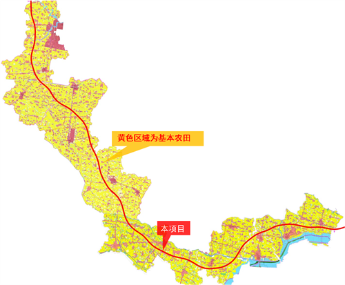 项目位于北方平原区,沿线永久基本农田占比较高,占沿线乡镇总用地比例53.6%,扣除建设用地、规划建设用地及生态红线后占比达77.7%;经过反复比选、论证路线,通过主线平纵的灵活设计,块状用地避让永久基本农田等综合措施,最终占比为65.98%,大幅低于沿线永久基本农田占比。