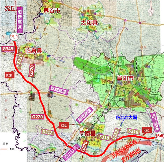 项目起点顺接合肥至周口高速公路寿县(保义)至颍上(南照)段并与G35济广高速交叉,经阜南南、临泉西,终于皖豫省界,向北延伸接规划濮阳至阳新高速公路,可达河南省周口市沈丘县,继而可与G35南京至洛阳国家高速公路相接,路线全长119.188公里。