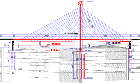 项目与谷河(定级VI级航道)交叉,综合分析桥位处地形、地质及地貌特点,充分论证地形、地质及全寿命周期安全性、经济性、合理性、景观性等方面综合考虑选用相应的桥型方案。本项目跨越谷河特大桥采用130+95m独塔斜拉桥方案,桥梁造型与所在区域的王家坝精神相呼应。