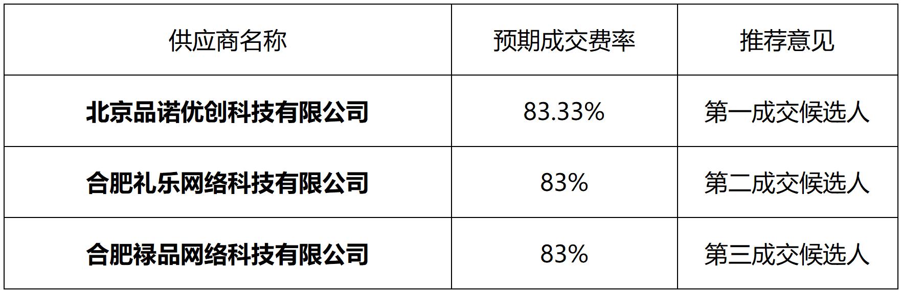 一、2022年度PA视讯集团工会会员电影、蛋糕通兑(券)采购项目(采购编号:W-2022-6),于2022年4月7日10时整(北京时间)在安徽省交通规划设计研究总院A1601开标,经评审,现将中标候选人公示如下: