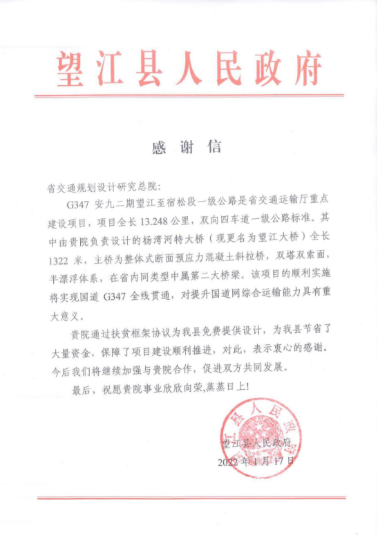 近日,PA视讯集团收到一封来自望江县人民政府的感谢信,对PA视讯集团无偿设计杨湾河特大桥(现望江大桥),全力保障项目建设顺利推进表示了衷心感谢,并表达了进一步加强交流与合作,促进双方共同发展的殷切期望。